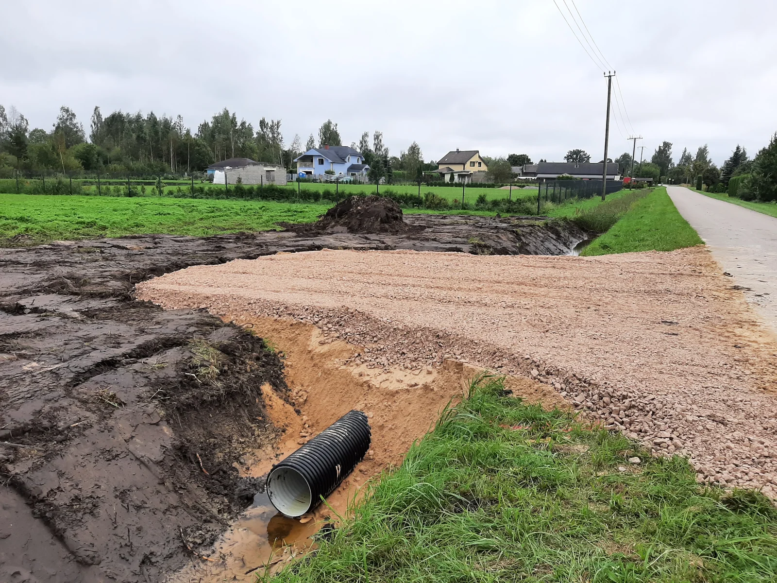 Jelgavā veikti caurtekas ieguldīšanas darbi, lai nodrošinātu piebraucamā ceļa izbūvi uz apbūvējamu zemes gabalu. Projekta ietvaros tika uzstādīta caurteka esošam grāvim, kas nodrošina ūdens brīvu plūsmu un kalpo kā pamats drošai un ilgtspējīgai piekļuvei īpašumam. Darbu gaitā tika veikta grāvja sagatavošana, caurtekas montāža, uzbēruma veidošana un ceļa seguma izbūve. Caurtekas šādos projektos ir būtiska infrastruktūras daļa – tās ne tikai ļauj šķērsot ūdensnotekas, bet arī novērš applūšanu un ceļa bojājumus, nodrošinot ūdens pareizu novadi. Pareizi izbūvēta caurteka ir neatņemama apbūvējama zemes gabala attīstības sastāvdaļa, kas garantē gan drošu piekļuvi, gan vides līdzsvaru.