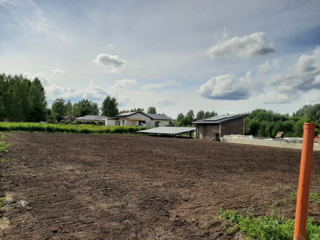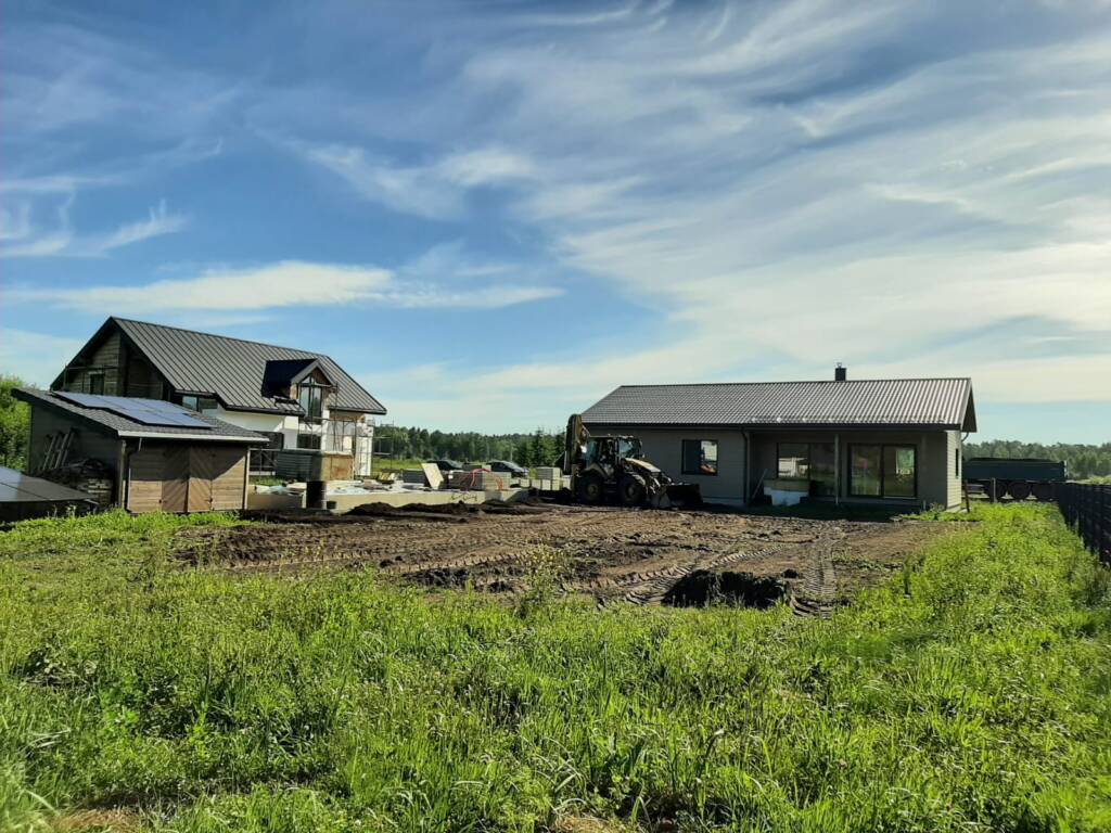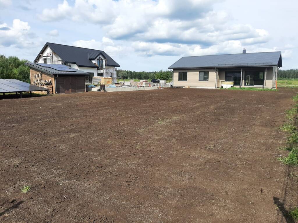 Pēc pamatnes sagatavošanas teritorijā tika iesēts zāliens, kas nodrošina patīkamu un koptu pagalma izskatu, kā arī veicina apkārtējās vides harmoniju ap ēku.